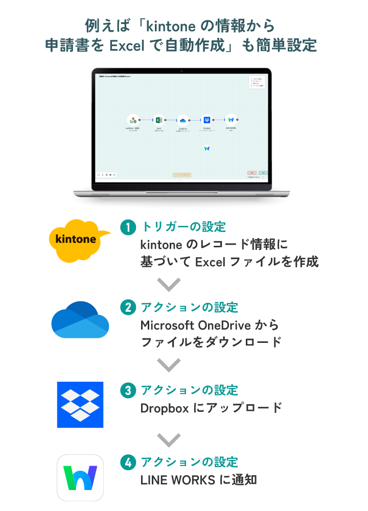 例えば「Kintoneの情報から申請書をExcelで自動作成」も簡単設定