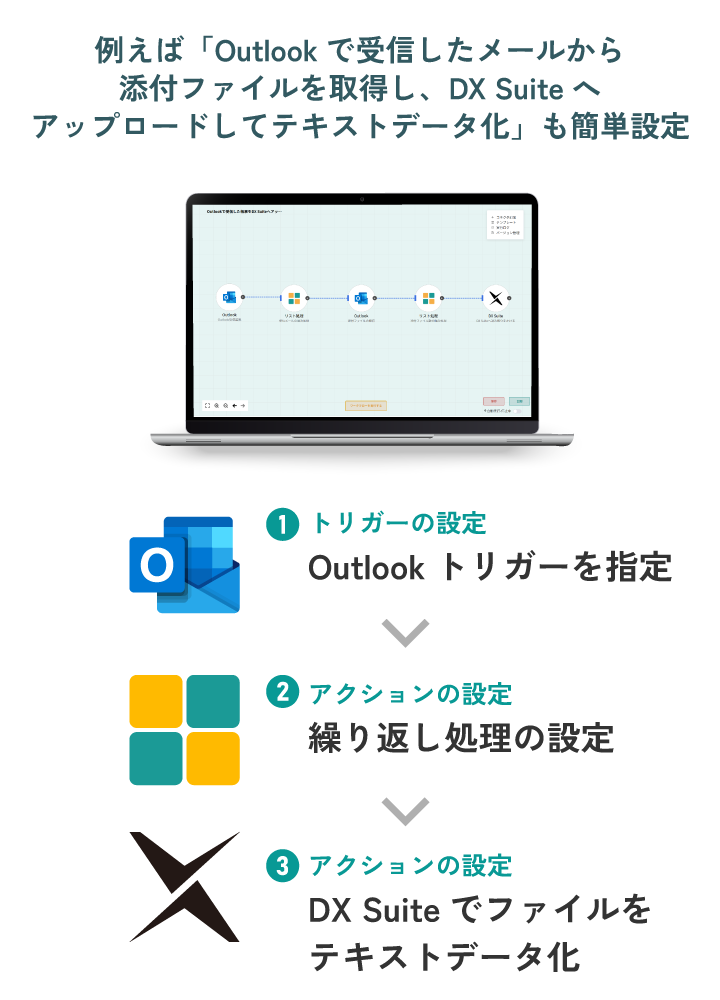 Outlookに届いたPDFや画像をAI-OCRでデータ化し、オンラインストレージに保存、その内容を要約して再びOutlookに送信。